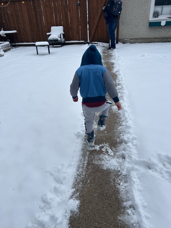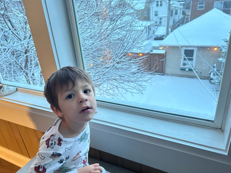 This morning we woke up to a winter wonderland. Snow covered the ground and just about everything else outside. Mikey was in awe. It was his first time ever seeing snow.